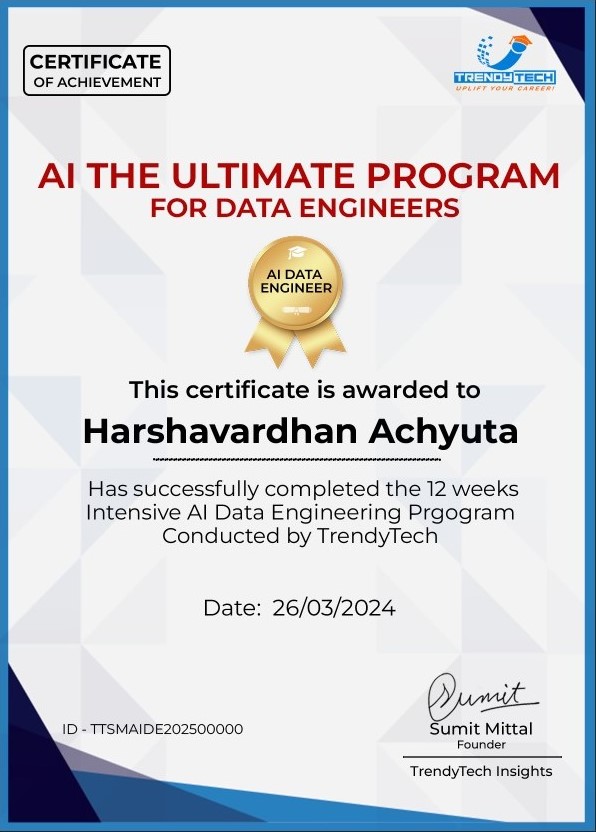 EXCELLENT Based on 2155 reviews Karan Shiwankar2024-12-19Trustindex verifies that the original source of the review is Google. The data engineering course was an excellent learning experience! It provided a solid foundation in data pipelines, ETL processes, and big data technologies. The instructors were highly knowledgeable, and the hands-on projects helped bridge the gap between theory and practice. The curriculum was well-structured, covering tools like Spark, SQL, and cloud platforms. Overall, a highly recommended course for anyone looking to start or advance their career in data engineering! Manoj Pal2024-12-18Trustindex verifies that the original source of the review is Google. Sumit Mittal's Big Data course with Apache Spark is outstanding! His ease of explanation and clear, real-world examples made complex topics easy to grasp. The comprehensive curriculum and Sumit's support for query resolution over the 2-year course lifetime were invaluable. The active, helpful community added even more value. This course helped me understand and apply concepts effectively in my organization, earning accolades for my work. Highly recommended for anyone looking to master Apache Spark and Big Data! Revathi Subbu2024-12-17Trustindex verifies that the original source of the review is Google. Very helpful course ,even for non tech person.This course covers all big data ecosystem like Apache spark, hive, scoop, Hbase, and pyspark. Also we can learn about streaming process, Cloud based bigdata technologies. Thank you Sumit Sir for this course. Nida Khan2024-12-16Trustindex verifies that the original source of the review is Google. The detailed content for Spark architecture and Spark Optimization helps in building the foundation for Spark learning. The teaching style of Sumit Sir by explaining concepts in very layman terms and practicals have been very useful the learning journey. Anil Yalameli2024-12-15Trustindex verifies that the original source of the review is Google. An excellent mentor means Sumit sir, he makes every complicated topics as easy. Topics covered are nosql, AWS, Apache spark and many more. I have got a good knowledge from this course. I stay in Singapore and it's been easy Prajwal R2024-12-15Trustindex verifies that the original source of the review is Google. The bigdata course is really extraordinary, and Sumit sir teaching is excellent and topics covered are spark, mapreduce, Kafka, airflow etc are thought very well. Priyank joshi2024-12-15Trustindex verifies that the original source of the review is Google. I completed the Trendy Tech Ultimate Big Data Masters Program and it was an excellent experience. The program offers hands-on projects, a cloud-focused curriculum, and expert guidance from Sumit Mittal, making complex topics like Spark, HIVE, Databricks, Azure and AWS easy to understand. Highly recommended for anyone looking to build a career in Data Engineering. Dilshad Qurishe2024-12-14Trustindex verifies that the original source of the review is Google. This is a very well structured course, with comprehensively covers a range of Big Data technologies and tools, with clear explanations and practical applications. Sumit Sir is an excellent instructor. He breaks down complex concepts into simple, easy-to-understand lessons and provides real-world examples that make the material relatable. His teaching style is engaging, and he’s always ready to answer questions or provide additional support. I personally love how he teaches from a grassroot level, even a layman can understand. The modules of Apache Spark, HIVE, Kafka were a cakewalk to learn, I didn’t believe I would learn them in such a short time, in such an in-depth manner Tarakanta Sahoo2024-12-14Trustindex verifies that the original source of the review is Google. Good experience